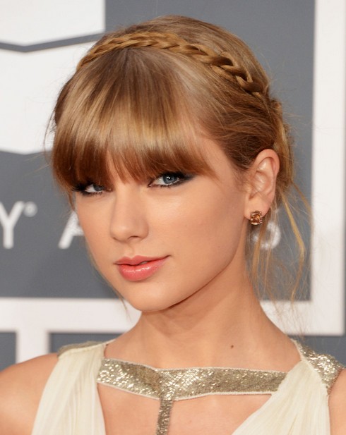 Taylor Swift Hairstyles: Braided Updo with Bangs